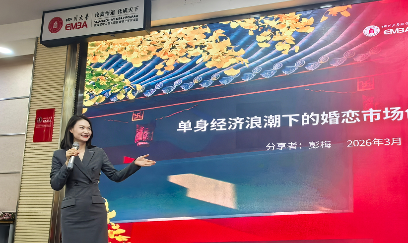 3月19日,四川大学商学院EMBA“望江e学堂”特邀四川大学商学院EMBA2024级学生、成都半熟恋爱科技有限公司总经理、成都星河璀璨企业管理有限公司总经理、觅友MEETU公众号创始人彭梅做《单身经济浪潮下的婚恋市场创新与实践》专题分享,聚焦当下单身经济发展趋势与婚恋行业转型痛点,以数据解析、模式拆解、案例剖析为核心,为同学们解锁婚恋市场创新发展路径。