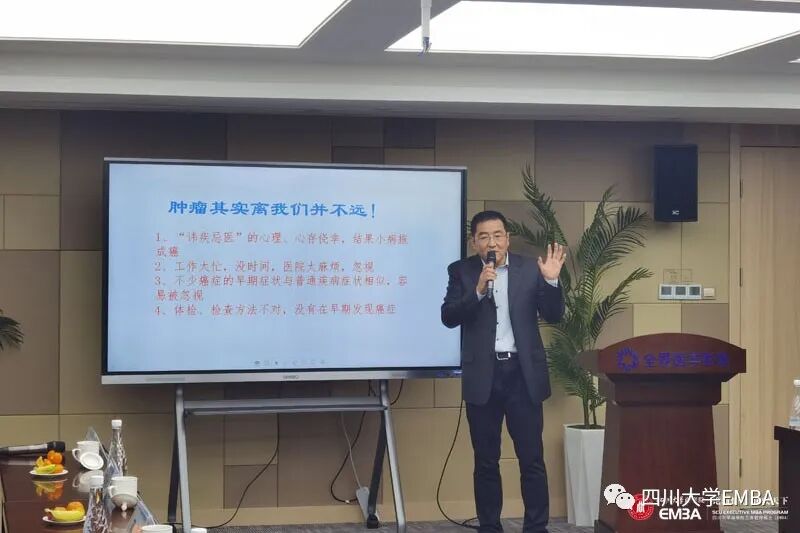 在健康沙龙的分享环节,川大EMBA校友会黄明良会长致辞,他倡导川大EMBA同学及校友不仅要把企业做好,更要热爱生活,爱护自己及家人的身体。同时也提到了未来会组织更多跨校之间的交流活动,鼓励更多的同学和校友参与进来。随后EMBA2011级春季班校友、四川仙知医疗科技有限责任公司的总经理赵克敏校友回忆了一位因肠癌去世的校友的过往,对这位校友的离开深表哀痛,他希望我们的企业家校友们不要因工作太忙,有小病未及时检查,心存侥幸,结果小病拖成大病,呼吁同学们都要重视关爱自己的身体,防患于未然,拥有好的体魄,才能奋斗更好的事业。