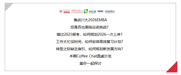 备战川大2026EMBA 您是否也面临这些挑战? 错过2025报考,如何规划2026一次上岸? 工作太忙没时间,如何安排高效复习计划? 转型之际缺乏指引,如何规划新发展方向? 本期Coffee Chat圆桌沙龙 邀你一起探讨