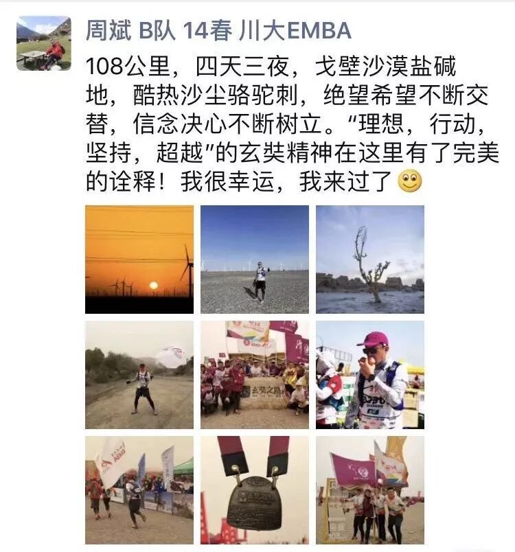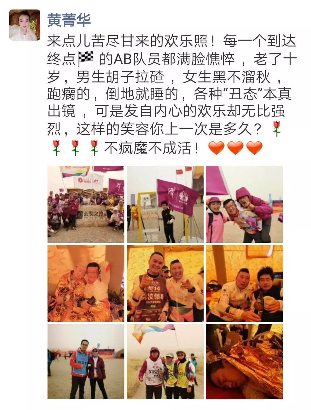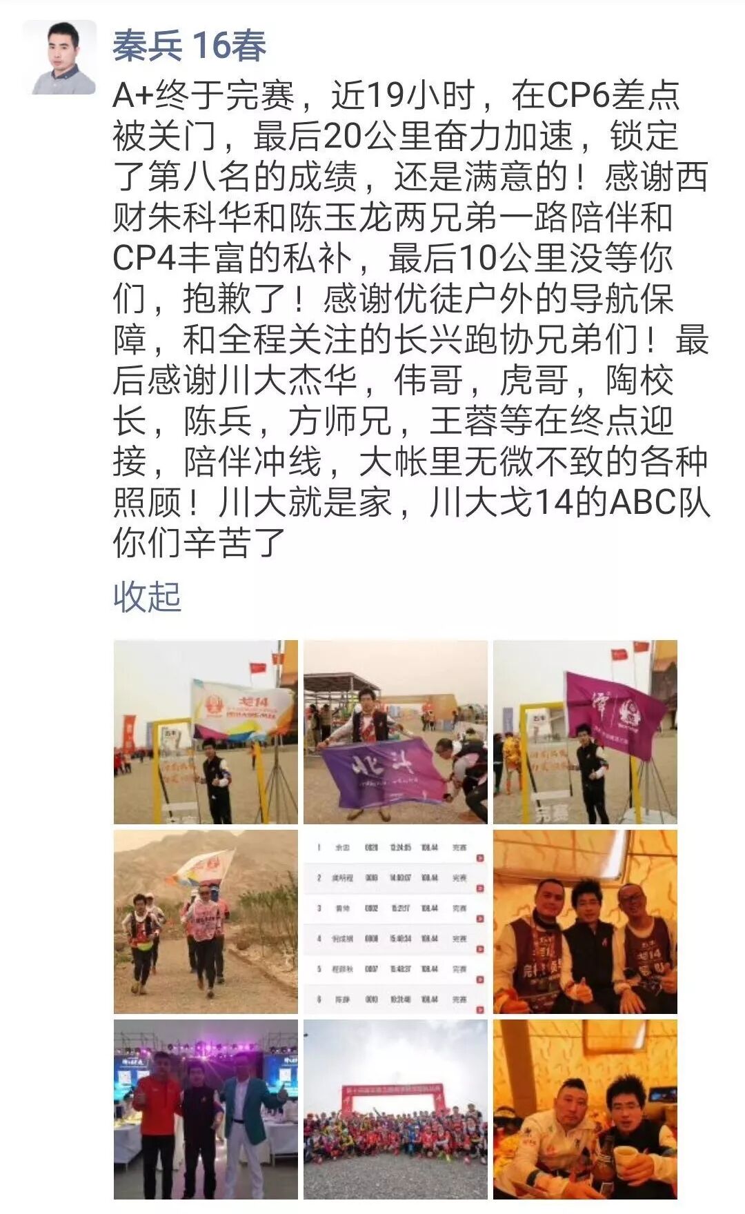 “太多的感谢无法言说。谢谢组委,谢谢老戈们。谢谢兵哥,杰华哥,金华哥,锐敏哥的赛事助力,王教练,周队医,榕姐无微不至的赛事保障。谢谢赞助商方师兄,周师兄与我们风雨同舟的大力支持。谢谢拥抱组特意赶来,关怀备至。谢谢C队全体对我们的支持与鼓励。非常感谢领导和同学们的支持与鼓励,谢谢!特别感谢组委感谢大家为我过生日。这是最有意义的生日。戈壁独特的风景,特别的体验,最美的人最好的感情,感恩大家~所有人的付出,铭记于心。爱你们!“