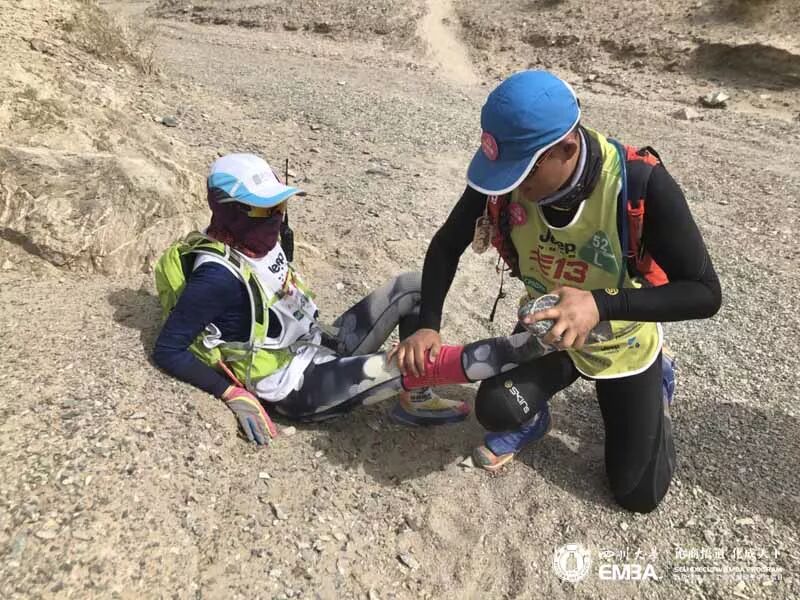 比赛日的第一天,我们五人结伴而行,前半程欢声笑语,走进山谷就已开始疲惫,一个下坡突然膝盖刺痛,只听我哎呦一声,戈壁骆驼,戈壁玫瑰,还有南京大学的一位领队立刻走了过来,问我怎么了?痛的走不了了?这时骆驼一个向前走的假动作站在原地没动,南京大学的戈友走上前来给我拉伸,当我们追上大师兄和好勤时,和她说你不应该走那么快,做为已婚的我应该把这次受伤的机会让给你。回来后我们才知道,原来勤勤同学的择偶标准是A+,戈壁男神们加油啊,跑进A+没准就能遇见你们这辈子的女神呦。第二天虽然疲惫,但还能承受。