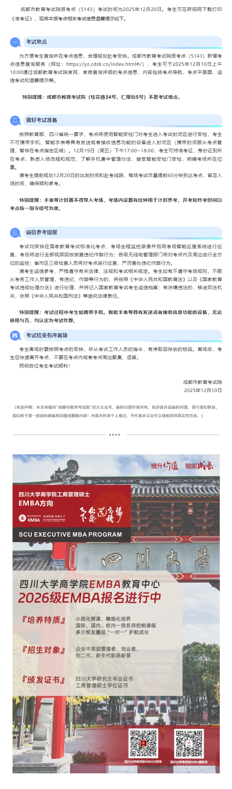 • 重要转载丨成都市教育考试院报考点(5143)2026年全国硕士研究生招生考试温馨提示(一)